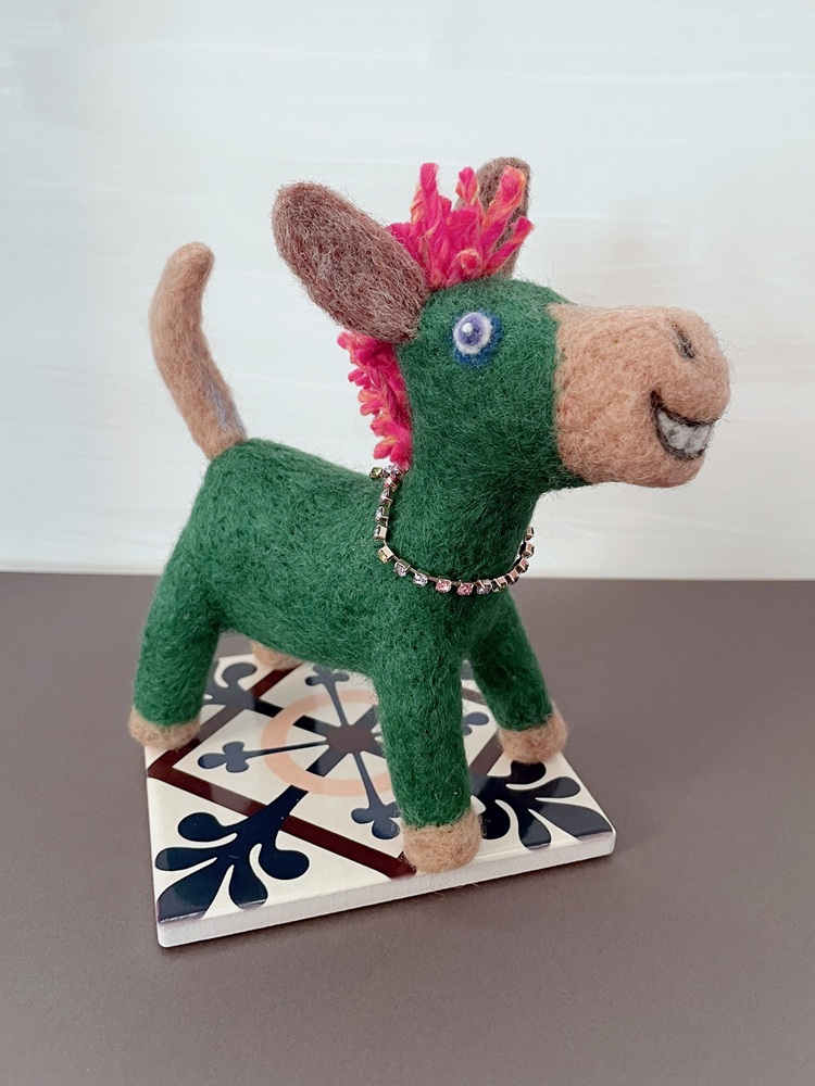 作品サイズ 23×10×16.6cm/ 羊毛・毛糸・プラ鈴 タイル付き